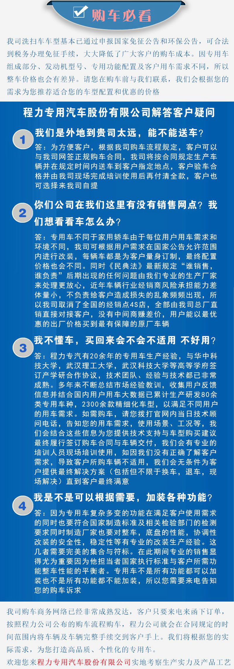 (7)我们这里有没有销售点?想看车怎么办? 专用车不同于小轿车之类的在全国各地设立销售公司4S店,这是由专用车的特殊性决定的。利用现在发达的商务网络,客户只要来电来函下订单,按照购车流程进行购车,会在合同规定的时间范围内将车辆及车辆完整手续交到客户手上。我们将根据用户的实际需求,为每位用户打造高品质、个性化的专用车,欢迎您来实地考察生产实力及产品工艺,我们会为您提供优质的服务!