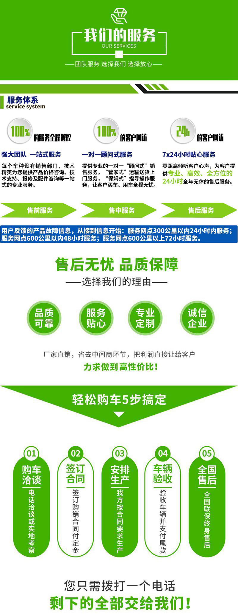 (7)我们这里有没有销售点?想看车怎么办? 专用车不同于小轿车之类的在全国各地设立销售公司4S店,这是由专用车的特殊性决定的。利用现在发达的商务网络,客户只要来电来函下订单,按照购车流程进行购车,会在合同规定的时间范围内将车辆及车辆完整手续交到客户手上。我们将根据用户的实际需求,为每位用户打造高品质、个性化的专用车,欢迎您来实地考察生产实力及产品工艺,我们会为您提供优质的服务!