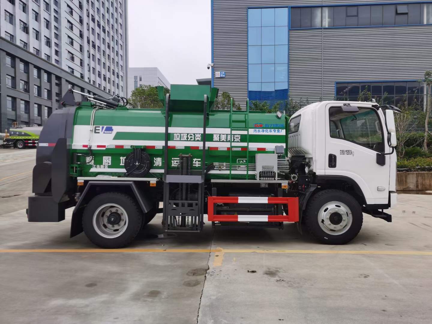 弧形罐体,边四底五/边五底六。2.长源/皖液油泵,长源/中梅多路阀,知名液压油缸。3.全推铲卸料(不带举升功能),具有干湿分离功能。液压后盖,后盖配防腐硅胶密封条。4.后门液压锁紧5.链条式提升机,可挂120/240升标准塑料垃圾桶。进料口盖液压开关。6.驾驶室内电控(提升机外部手动**),后门锁紧与后盖开关的操作具有防误操作。7.箱体带清洗装置(液压马达带动高压泵、带水箱)。