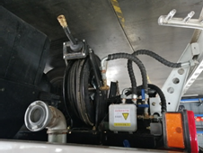 (1) 清水箱充分利用了车载空间,容积大,可达8m3。垃圾箱采用单层304不锈钢结构,倾翻卸料,带高压自洁装置。自洁装置可在垃圾箱卸料时帮助卸料,清洗垃圾箱内部。 。
